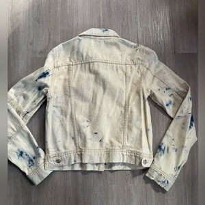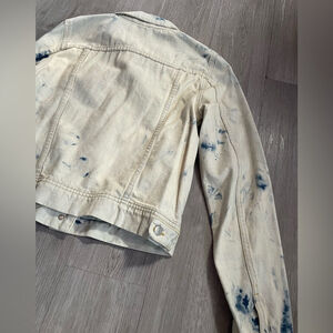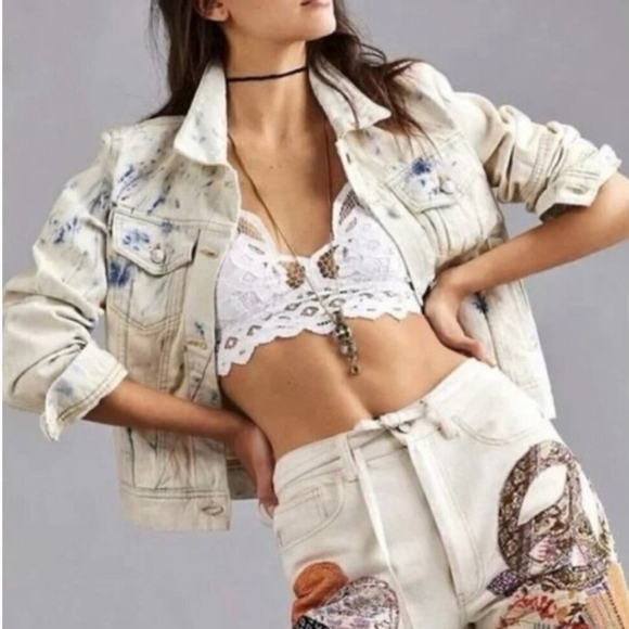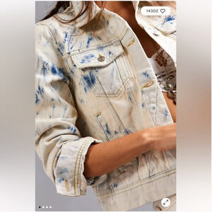 Keywords: Free People denim jacket, tie dye denim, acid wash jacket, Jones Rumors, boho style, FP Rumors jacket, festival style, casual chic, Y2K denim, boutique outerwear