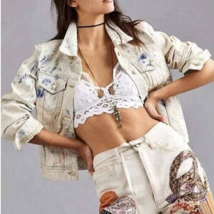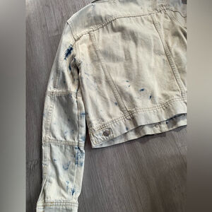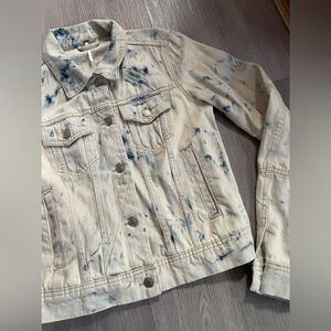 Gorgeous Free People “Rumors” denim jacket featuring a cream + blue Jones tie-dye/acid wash finish. Soft, lightweight cotton denim with a relaxed, slightly cropped silhouette. Perfect layered over basics, dresses, or athleisure looks.