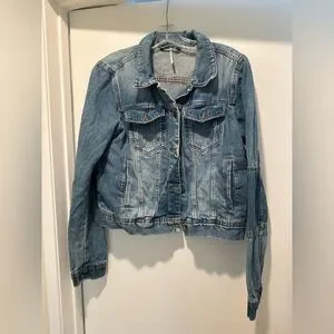 Stylish light blue jean jacket. Features classic button front and chest pockets. Ideal for casual wear.
