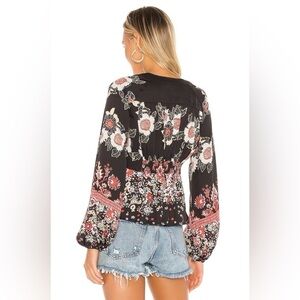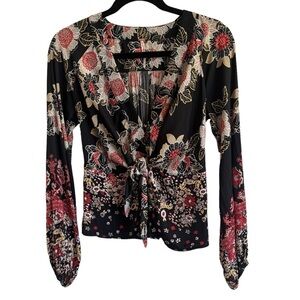 Gorgeous satin tunic top from Free People. Black with red, cream, and gray florals throughout. Size XS and in great preowned condition; no visible flaws.