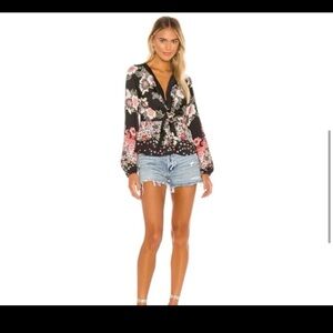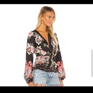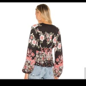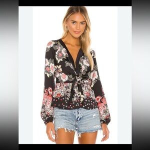 Made from a lightweight fabric, the blouse is adorned with a bold floral print in shades of red, white, and gold against a black background.