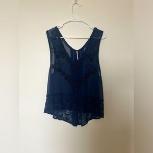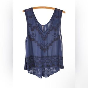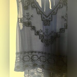 stunning sheer deep navy blue tank with intricate black semi-gloss beading detail throughout.