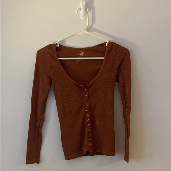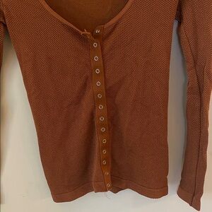 Chic button-down with scoop neckline. Long sleeves for a cozy fit. Perfect for layering.