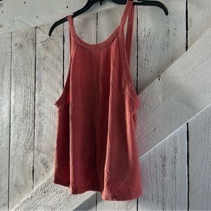 rust orange, ribbed fabric, sleeveless, casual wear, summer top, lightweight, fitted, basic tank, warm tone, minimalist