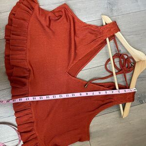 Stylish rust tank top with ruffle hem. Features tie-back detail. Perfect for casual wear.