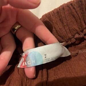 Free People rust two-piece set with ruffle details. Bandeau strapless top. High waisted shorts with elastic detail. I’m a M and these fit just fine! FP beach. Linen rust color.