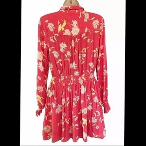 Free People Ruthie Printed Mini Dress. Dress is orange with a yellow and blue floral print. Dress is made of rayon and is a woman's size XS.
