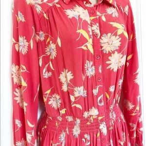 Effortless shirt dress featuring a femme floral print and smocked detailing at the waist and sleeve cuffs. Easy to wear fabric and relaxed silhouette. Lined.