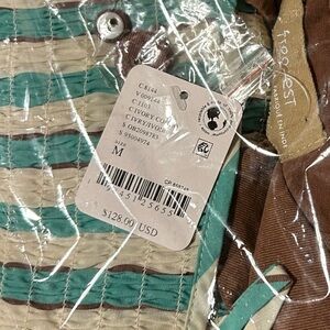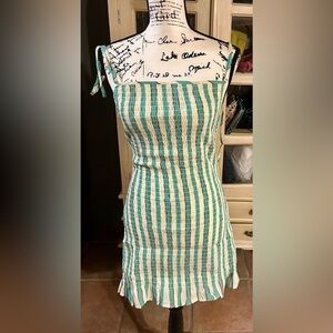 Features: Dress: Square neckline, classic striped fabrication, ruffle hemline, tie straps; Shirt: Button-up front closures, classic collared neckline, dropped side pockets