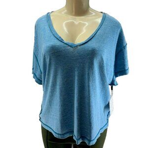 Free People S Baja Blue V-Neck Raw Edges Relaxed Fit Open Back Short Sleeve Tee