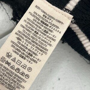 Color/Pattern: Black and White Stripe, Horizontal Stripes, Vertical Stripes (on peplum), High-Contrast.