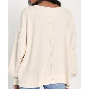 Free People Size Medium Oversized Beige Boxy Waffle Long Sleeve Thermal Top Women Neutral Trendy Cotton Blend Comfortable Causal