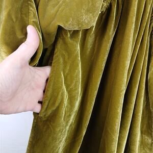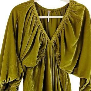 Features: Soft velvet fabrication, plunging V-neckline, ruched detail throughout, balloon sleeves, cinched detail at waist, lined