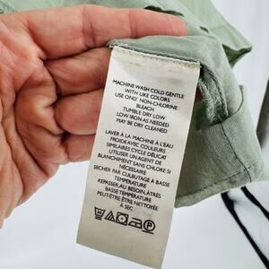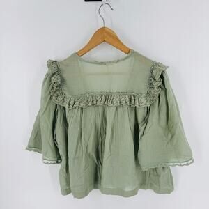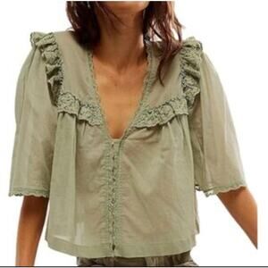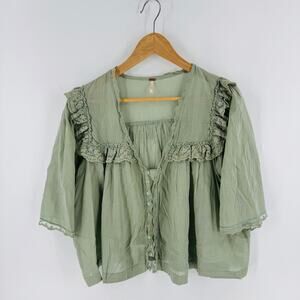 Free People Sage Green Lace Trim Peasant Top Size M Boho Ruffle Button Front