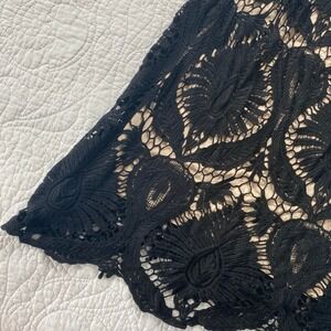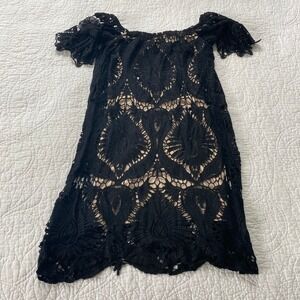 American made off-the-shoulder crochet lace dress featuring beautiful scalloped trim and sheer sleeves. Elastic neckline for an effortless fit. Fully lined with nude-colored fabric.