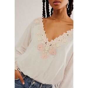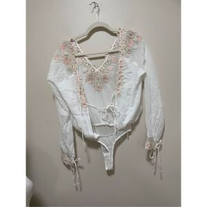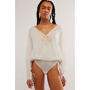 So delicate in every way, this floaty, long-sleeve bodysuit features an intricate floral-adorned neckline and a daring, fully-open back.