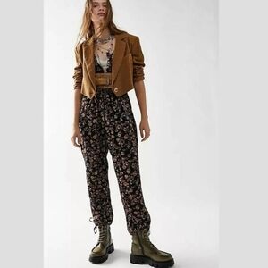 Chic and stylish floral black jumpsuit perfect for any occasion. Comfortable fit with a trendy design. back and sides pockets. adjustable tie waist. raw edges. minor flaw last picture. (can be fixed barely noticeable)