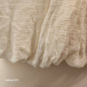 Free People Sand Blouse. NWT. Size XS. No rips/stains/pulls. NWT. Easily a small. Boho looks. Off white with embroidery. Cinched at bottom and at wrists. Lined in bodice, not sleeves. Material: Cotton/Viscose. Measurements: Pit to Pit: 16 inches. Shoulder to bottom: 22 inches. Very soft, has some stretch. Smoke free home. No odors. All offers are welcome. Thank you! Over the head, no zips or buttons.