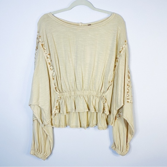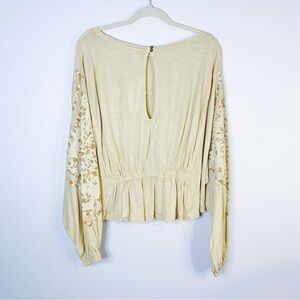 Free People long sleeve blouse in color sand combo. Floral print detail. Comes with extra button. Gathered detail at waistline. Elastic at sleeves.