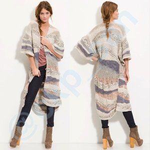 Beautiful and rare Free People Sands Of Time cardigan in size Small. So effortless with a cozy slouchy fit, this asymmetrical striped kimono style mid-length cardigan features open front style with rough seaming and raw fringed edges for the perfect lived-in look. Perfect for layering. Colors: Blue/Gray, Peach/Apricot, Off White, Silver Metallic. Excellent condition. Please see pictures for details, condition, fabric content & measurements, since they are part of the description. Sold out for many years. Reasonable offers welcome.