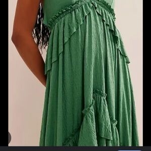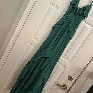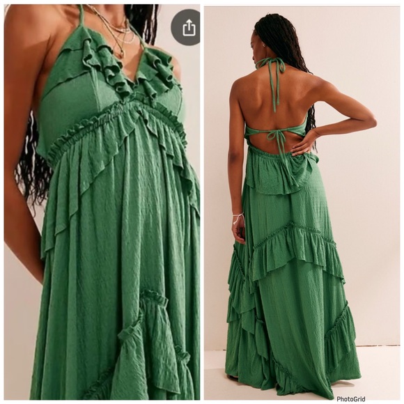 Chic emerald backless dress with ruffle accents. Halter neck design. Ideal for stylish outings.