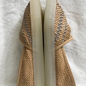Free People Santorini Slip On Woven Leather Women's US Sz 9 Mens7.5 Slide Casual Shoes Loafers .Natural Tan color with Grey /Brown strip accents Insole label slightly erased with slight crease