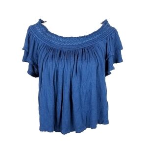 In a lightweight crinkle fabrication, this flouncy off-the-shoulder crop top features a smocked elastic neckline for an easy, effortless fit. Keyhole cutout at the bust and ruffle sleeve detail. Swingy, shapeless silhouette. 97% Rayon, 2% Polyester, 1% Spandex. Excellent Pre-owned condition. No flaws. Approximate measurements: 25" chest, 15" length.