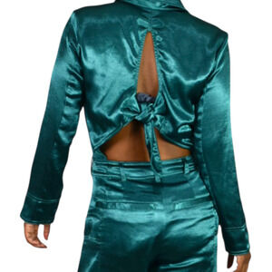 The top features a collared neck, long sleeves, and front patch pockets. The back is the true showstopper with a daring open cutout that ties at the center for an adjustable fit. The wide leg pants give a dramatic, flowy finish.