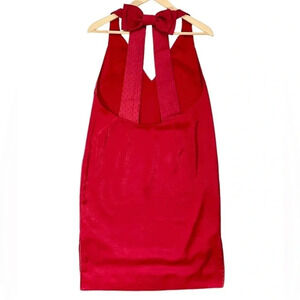 Super luxe, silky dress featuring a low, strappy back with contrast dot fabrication trim. Back hook-and-eye closure with large bow accent. Shapeless silhouette and side vents for an easy fit.
