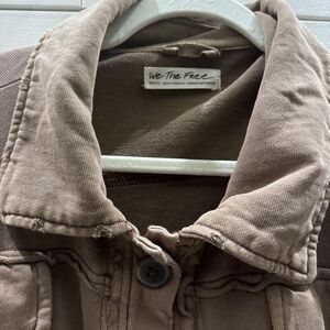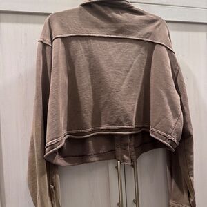 This jacket is pre-loved. The fabric is light - it's not heavy or stiff. Style is cropped and distressed.. Color is brown. Coming from a smoke free home.