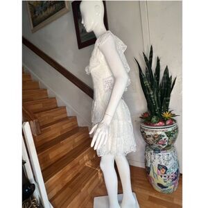 Turn heads in this totally timeless mini dress featured in a lovely lace fabrication with ruffle detailing at top and tiered piecing at bottom for an added ethereal touch.
