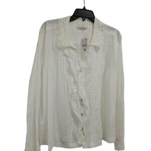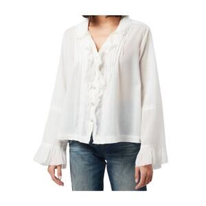 New with tags Free People button-down blouse in ivory, size Medium. Features soft pleating, romantic ruffles, and long sleeves—perfect for layering or styling solo. Lightweight and breathable with a flowing silhouette. Originally retailed for $128. Great for casual summer days, vacation, or cottagecore-inspired looks. Pairs beautifully with denim, skirts, or under a vest or blazer for added texture.