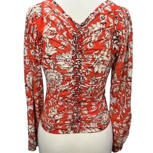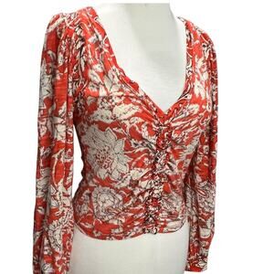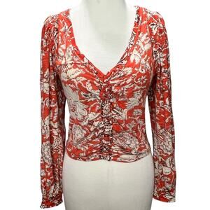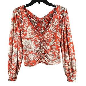 Free People Say The Word Crop Top XS Ruby Red Floral Ruched V Neck Boho Chic