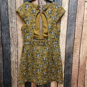 Free People brand size 10 dress Say Yes Mini Dress in Mustard Combo color, new with cut tags. This is a gorgeous, heavy fabric backless dress with cap sleeves and a side zip closure. Metal ring details on the front and back tie the whole dress together. The top half of the dress is lined in 100% rayon.