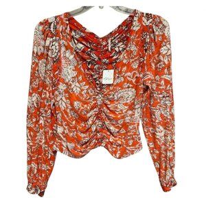 Free People Say the Word Top Sz L Red Floral Combo Peasant Sleeve Cotton Modal