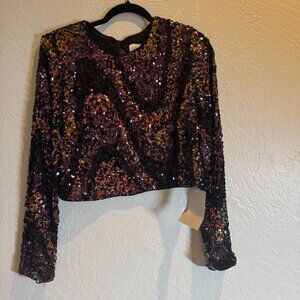 Stand out in this so stunning set featured in a colorful, sequin-adorned fabrication with cropped long sleeve top perfect done-in-one look for any special event.