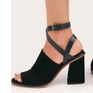 Very soft black suede upper with raw cut edge, open toe, sculptural suede block heel, and leather ankle wrap buckle straps