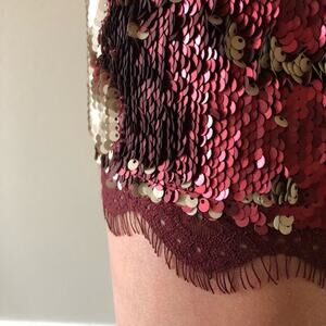 Dark red sequins that can flip or reverse to gold- just run your hands over the sequins to flip them and change the color.