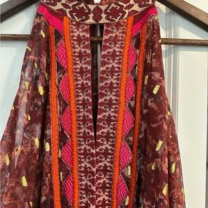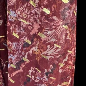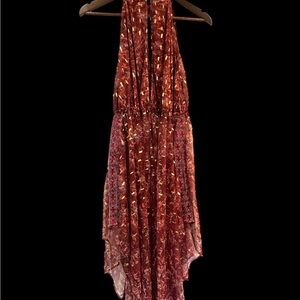 This Free People Semi-Sheer Moroccan Halter Top Dress in XS is a stylish and elegant option for a party or cocktail event. This wine and gold dress features a unique printed pattern with metallic flecks, intricate embroidery, and a tapered hemline for a unique and bohemian look. The sleeveless design, halter neckline, and open bodice add a touch of sophistication, while the tulle fabric and semi-sheer construction give it a romantic and feminine vibe. Perfect for summer and fall seasons, this dress is sure to make a statement with its distinctive details and brand.
