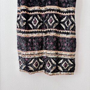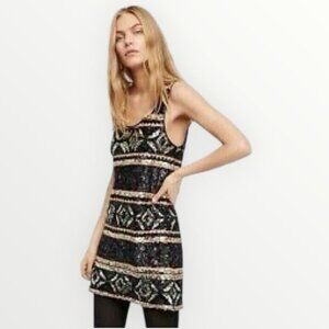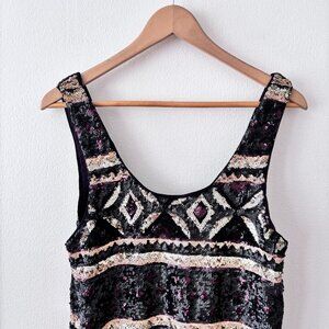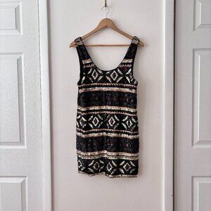All eyes on you in this mini dress featuring a shift shape with shimmering sequins allover in an aztec-inspired print.