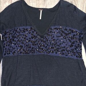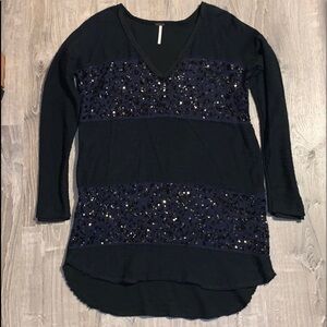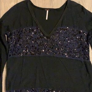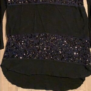 Long sleeve black sweater with blue stripes and sequins. Oversized, v-neck, high-low and raw-edge hem.