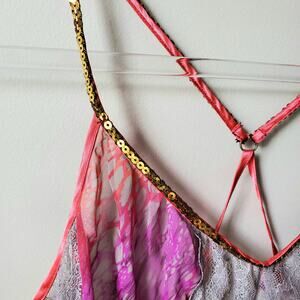 Colorful sheer chiffon with gray lace inserts. Sequined straps with a looped cross back.