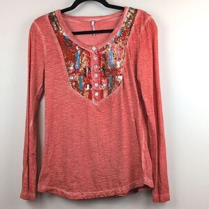 Free People Sequined Long Sleeve Henley Top Size M Boho Festival Western