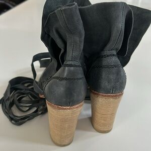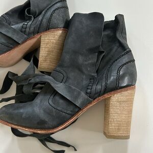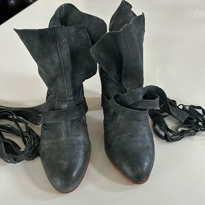 Booties are in excellent used condition. They are lightly worn. They are preowned and you will see signs of being worn. There are a few scuffs. Make sure to see all photos. They are a black grey color. Super soft leather! Really fun with the tassels tie. Unique!!