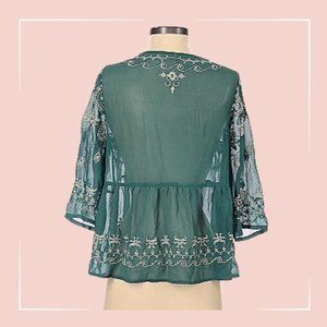 Gorgeous and delicate 3/4 sleeve blouse by Free People. Teal color with tan floral embroidery, ruffled sleeves, buttons, loose flowy fit. Excellent pre-loved condition.