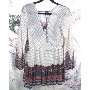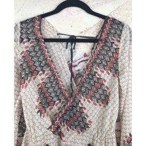 Beautiful XS Free People Boho Top! This sheer tunic with flattering v-neck ties in the back to create the perfect shape! The top is in excellent condition except for a small pull on upper right shoulder. This flowy top is both flattering and fun!