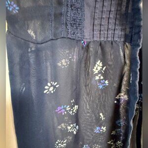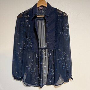 Free People Sheer Navy Floral Button-Down Blouse with Lace Detail – Size M