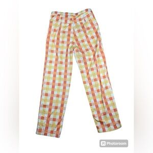All cotton pants with straight or slightly tapered leg. Inseam 27”. Soft fabric. Bold and colorful plaid. No pockets. Cropped or full length depending on your inseam.