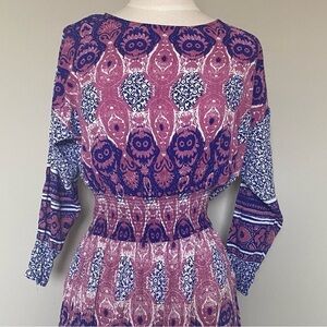 Printed flowy midi/maxi dress with a V-neck that can be worn to the front or back. Smocked elastic band around the waist allows for for an easy fit.