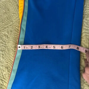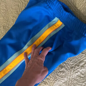 Free People She's A Rainbow Wide Leg Flare Baja Combo Track Pants $128.00. These pants are very versatile and can be worn for all athletic activities as well as comfort only. Wear them around the house or to shop and do errands. The adjustable waist allows you to roll them down and wear them as low rise pants as well as high rise. They snap about halfway up the pant legs.
